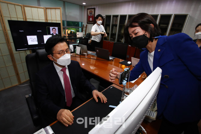 [이데일리 노진환 기자] 국민의힘 허은아 의원(오른쪽)이 14일 오전 국회 의원회관 사무실에서 온라인으로 열린 '명불허전보수다'에 강연을 위해 참석한 황교안 전 미래통합당 대표를 안내하고 있다.