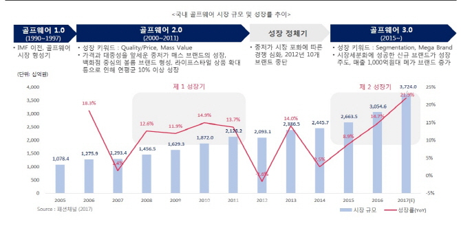 전통적인 럭셔리 의류 브랜드가 하락세를 이어가고 있는 반면 골프 의류 시장은 고가 브랜드 판매가 증가하고 있다. 레저산업연구소에 따르면 골프웨어의 매출이 2013년부터 매년 3000억 규모로 성장하며, 올해 3조원을 돌파할 것으로 예상된다. 골프 인구 증가세가 이어지면서 매년 가파른 성장세가 이어지고 있기 때문이다. 골프웨어의 성장세가 두드러지면서 의류업체들이 럭셔리 골프웨어 출시도 늘리고 있다.