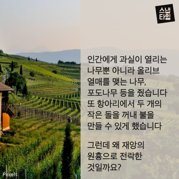 인간에게 과실이 열리는 나무뿐 아니라 올리브 열매를 맺는 나무, 포도나무를 줬습니다. 또 항아리에서 두 개의 작은 돌을 꺼내 불을 만들 수 있게 했습니다. 그런데 왜 재앙의 원흉으로 전락한 것일까요?