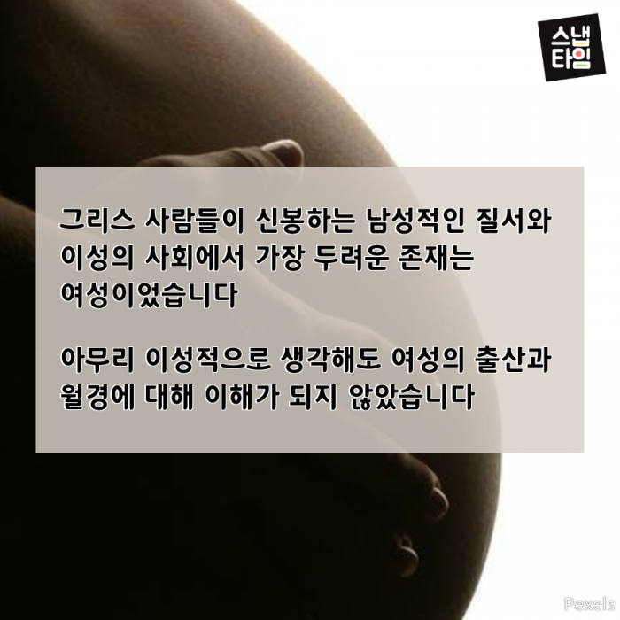 그리스 사람들이 신봉하는 남성적인 질서와 이성의 사회에서 가장 두려운 존재는 여성이었습니다. 아무리 이성적으로 생각해도 여성의 출산과 월경에 대해 이해가 되지 않았습니다.