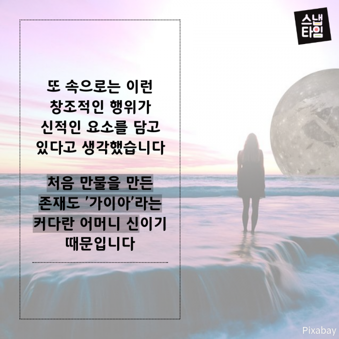 또 속으로는 이런 창조적인 행위가 신적인 요소를 담고 있다고 생각했습니다. 처음 만물을 만든 존재도 ‘가이아’라는 커다란 어머니 신이기 때문입니다.