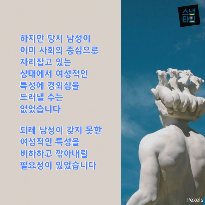하지만 당시 남성이 이미 사회의 중심으로 자리 잡고 있는 상태에서 여성적인 특성에 경외심을 드러낼 수는 없었습니다. 도리어 남성이 갖지 못한 여성적인 특성을 비하하고 깎아내릴 필요성이 있었습니다.
