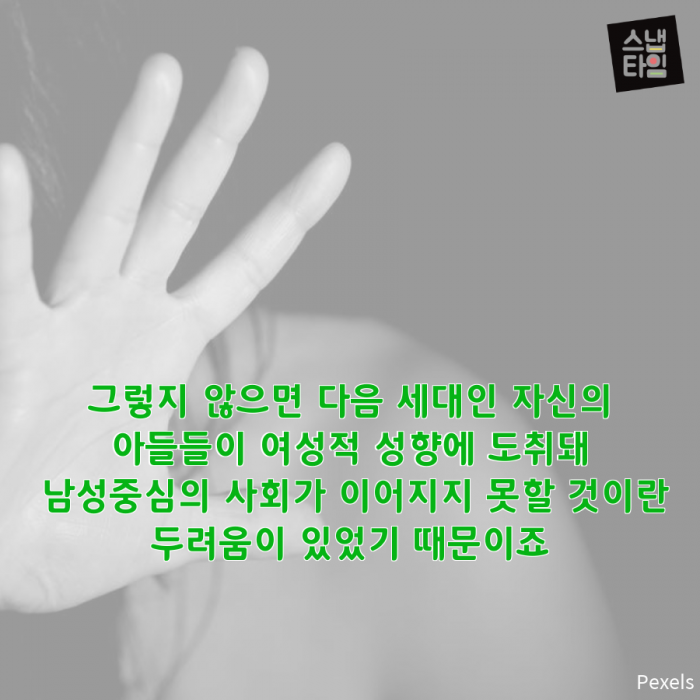 그렇지 않으면 다음 세대인 자신의 아들들이 여성적 성향에 도취돼 남성중심의 사회가 이어지지 못할 것이란 두려움이 있었기 때문이죠.