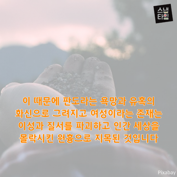 이 때문에 판도라는 욕망과 유혹의 화신으로 그려지고 여성이라는 존재는 이성과 질서를 파괴하고 인간 세상을 몰락시킨 원흉으로 지목된 것입니다.