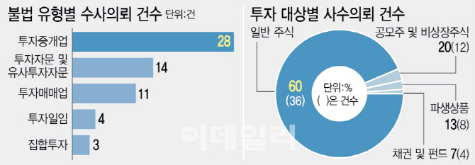금감원이 수사 의뢰한 불법 금융투자업자 유형엔 증권사 등을 사칭한 ‘투자중개 유형’(28건·46.7%)이 가장 많았고, 주식정보 제공·자문을 빙자한 ‘투자자문 유형’(14건·23.3%), ‘투자매매 유형’(11건·18.3%)이 뒤를 이었다. 투자상품별로는 주식(36건·60%), 공모주·비상장주식(12건·20%), 해외선물 등 파생상품(8건·13%) 순이었다.