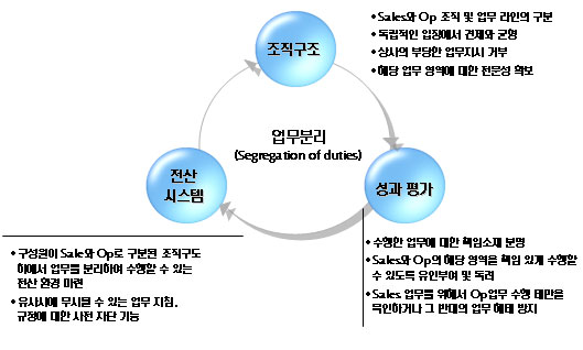 또 각 담당자가 업무를 분리해 수행할 수 있는 내부통제 시스템, 즉 전산지원도 구축돼야 한다는 설명이다. 업무분리에 대한 정보통신(IT)지원이 이뤄지지 않을 경우 유사시에 규정을 무시한 업무가 처리될 수 있기 때문이다.