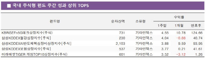 삼성자산운용의 ‘KODEX AI반도체핵심장비’ ETF는 같은 기간 3.88% 올라 주간 수익률 3위를 차지했다. 이 상품 역시 SK하이닉스(26.18%)와 삼성전자(24.64%)를 비롯해 이수페타시스(11.82%), 한미반도체(042700)(7.86%), 리노공업(4.77%), 이오테크닉스(039030)(3.20%) 등을 포트폴리오에 담고 있다.