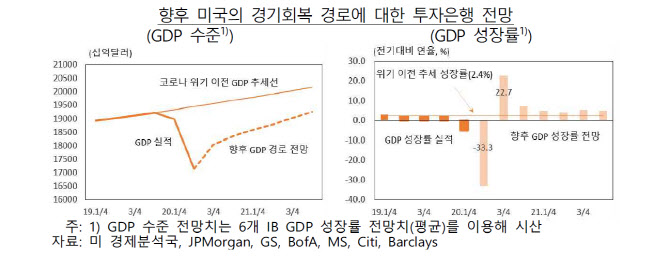 이같은 여건을 고려할 때 향후 미국 경기는 ‘완만한 회복’을 나타낼 것이라는 게 한은의 분석이다. 한은은 “현 상황에서 ‘빠른 회복’은 기대하기 어려우며, 바이러스 재확산 또는 기업 파산 급증 등이 발생할 경우 ‘재침체’ 가능성도 상존한다”고 밝혔다.