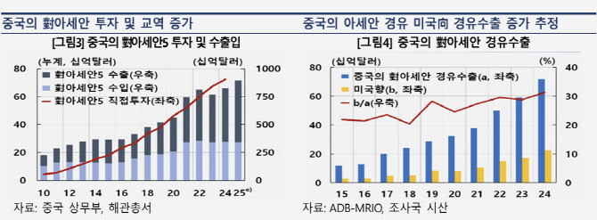 2010년대 중반 이후 중국 제조업 경쟁력 강화와 글로벌 공급망 집중으로 아세안이 보완 생산기지로 부상했고, 중국의 아세안 투자액은 2010~2014년 24억달러에서 2020~2024년 101억달러로 급증했다. 교역 규모 역시 3098억달러에서 7435억달러로 두 배 이상 확대됐다.