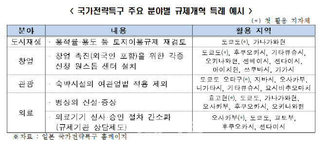 일본 국가전략특구는 지역단위에서 먼저 추진하고 이를 전국으로 확산시키는 전략이다. 통상적인 규제개혁이 이해상충 등을 이유로 추진되기 어려운 경우가 많아서다. 국가전략특구는 의료나 관광 분야 등에서 오랜 기간 규제개혁이 어려웠던 ‘암반규제’ 해소에도 효과를 보고 있다.