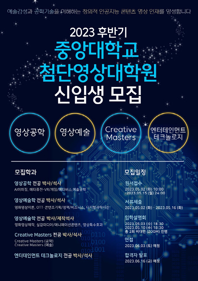 중앙대 첨단영상대학원은 2023학년도 후반기 모집에서 영상학 박사, 석사 및 제작석사 과정을 모집하며, 서류심사와 심층면접을 통해 선발할 예정이다. 학사 또는 석사 학위 소지자는 전공에 상관없이 지원할 수 있다. 첨단영상대학원은 5월 10일 지원자들의 이해를 돕기 위한 입학설명회와 함께 관련 전공 교수와의 커리큘럼 및 향후 진로 관련 상담을 진행할 예정이다.