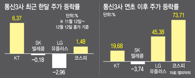최근 한 달(11월12일~12월12일) 기준으로는 KT만 6.37% 상승하며 시장(1.48%) 대비 강세를 보였고 SK텔레콤(-0.18%)과 LG유플러스(-2.96%)의 경우 마이너스 수익률을 기록했다. 배당 선호 현상이 뚜렷해지는 연말임에도 투자자들의 관심이 둔화됐다는 점이 업종 전반에 부담 요소로 작용하는 것으로 풀이된다.