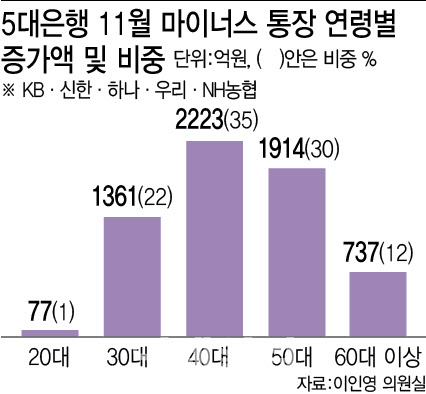시계를 넓혀 올해 1월부터 11월까지를 보면, 2030세대의 마통 잔액은 줄어든 반면 40대 이상은 늘었다. 50대의 증가액이 3226억원으로 가장 컸으며 40대는 1446억원, 60대 이상은 2216억원이었다. 20대와 30대는 각각 472억원, 1564억원 감소했다.