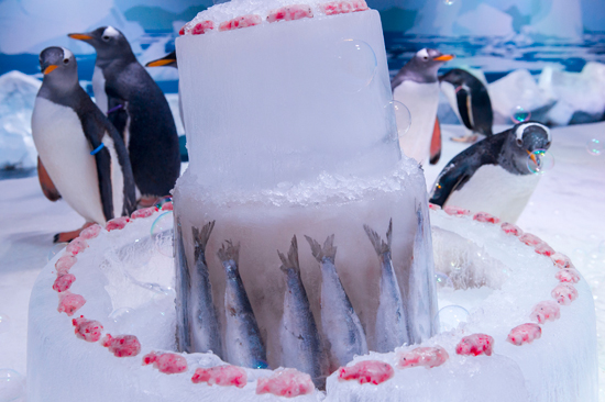 씨라이프 수족관은 1주년을 축하하기 위해 젠투 펭귄들에게 물고기로 장식한 아이스 케이크를 선물했다.