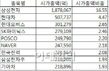 반면 포스코는 철강업황 침체로 실적 악화를 겪으며 시가총액 순위가 두단계나 미끄러졌다. 지난 주말 28만6000원까지 하락하며 연중최저가를 갈아치우기도 했다. 지난해 4분기 포스코의 영업이익은 4876억원으로 시장 전망치를 9.4% 밑돌았다. 한국투자증권은 “국내 철강 수요가 정체된 가운데 올해부터 다시 공급이 늘어날 예정”이라며 “특히 철강업황 개선이 실적 개선의 관건인데 이 또한 기대하기 어렵다”고 말했다.