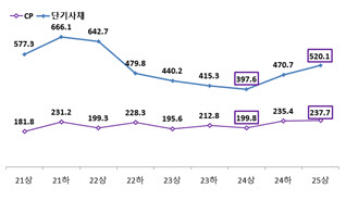 단기사채 발행금액은 520조 641억원으로 전년 동기(397조 6014억원) 대비 122조 4647억원(30.8%) 늘었다. 일반단기사채는 364조 9377억원, ‘PF(프로젝트파이낸싱) AB’ 단기사채는 74조 8090억원, 기타 AB단기사채 80조 3175억원으로 각각 전년 동기 대비 31.2%·16.2%·46.0% 증가했다. 상반기 말 기준 단기사채 잔액은 79조 2670억원으로 지난해 상반기 말(67조 6851억원) 대비 11조 5819억원(17.1%) 늘었다.