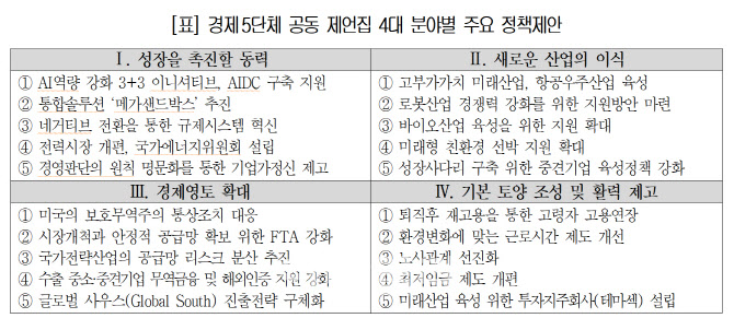 경제5단체는 제언집을 통해 △성장을 촉진할 동력 △새로운 산업의 이식 △경제영토 확대 △기본 토양 조성 및 활력 제고 4대 분야별 주요 정책을 제안했다.
