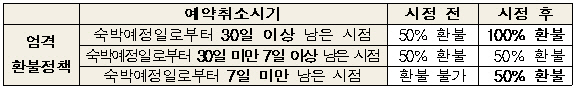 여기에 숙박예정일로부터 7일 이내에 취소할 경우 전혀 환불하지 않는 것은 사실상 계약해지가 불가능하도록 규정하고 있는 것이죠. 소비자분쟁해결기준에서는 성수기주말을 기준으로 할 때 5일 전 취소는 요금의 40%, 3일전 취소는 요금의 60%, 사용예정일 1일전 또는 당일 취소라고 하더라도 요금의 90%를 위약금으로 공제하고 나머지는 환급을 하고 있습니다.