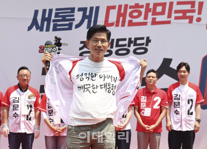 [이데일리 방인권 기자] 김문수 국민의힘 대선 후보가 1일 서울 강남구 코엑스에서 열린 선거유세에서 웃옷을 벗으며 방탄복이 없음을 보여주고 있다.