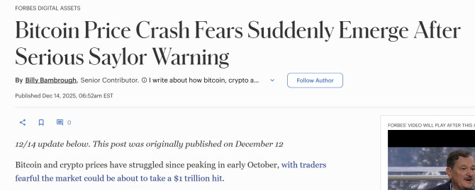 미국의 경제 미디어인 포브스는 14일(현지시간) ‘마이클 세일러의 중대한 경고 이후 비트코인 가격 폭락 우려가 갑자기 부상’ 제목의 기사에서 “비트코인과 암호화폐 가격은 10월 초 고점을 찍은 이후 부진한 흐름을 보이고 있다”며 “트레이더들은 시장 전체가 1조 달러 규모의 타격을 입을 수 있다고 우려하고 있다”고 보도했다.