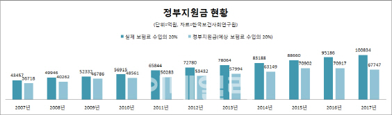 현재 정부의 국가지원은 13% 수준에 불과하다. 박능후 보건복지부 장관이 1조원 증액을 약속했는데 1조원이 늘어도 지원수준은 14% 정도다. 정부가 이번에 가입자단체들에게 내건 부대조건을 충족하려면 국고지원이 1조원 이상을 크게 웃돌아야 한다는 얘기다.