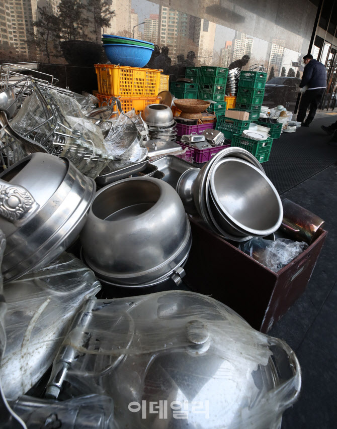 [이데일리 방인권 기자] 코로나19 장기화로 서울 시내 호텔들이 부동산시장에 매물로 쏟아져 나오고 있는 가운데 영업 마지막날인 31일 서울 서초구 쉐라톤 서울 팔래스 로비에서 호텔집기들이 쌓여 있다.