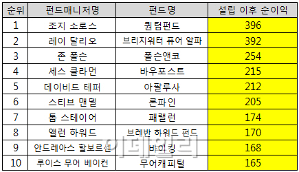 릭 소퍼 LCH인베스트먼트 회장은 “이들 상위권 펀드들은 헤지펀드 인덱스보다 훨씬 좋은 성적을 거뒀다”고 말했다.