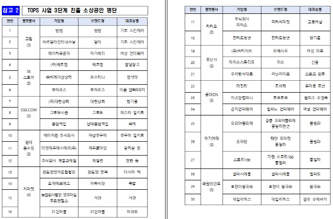 최종 단계인 3단계에서는 30개사를 선정해 플랫폼 연계 기획전, 홈쇼핑·백화점 진출, 라이브커머스 기획, 피칭대회 등 고도화된 성장 프로그램을 집중 제공한다.