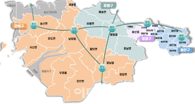 신설되는 화성시 4개 일반구의 관할 행정구역은 △만세구-우정·향남·남양읍, 마도·송산·서신·팔탄·장안·양감면·새솔동 △효행구-비봉·매송·정남면, 기배동 △병점구-진안·병점1·병점2·반월·화산동 △동탄구-동탄1~9동으로 구분될 예정이다.