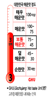 고추장 매운맛 등급은 매운맛을 나타내는 매운맛 단위(GHU)를 사용해 ▲순한맛(Mild Hot) ▲덜 매운맛(Slight Hot) ▲보통 매운맛(Medium Hot) ▲매운맛(Very Hot) ▲매우 매운맛(Extream Hot) 등 5단계로 구분하게 된다.