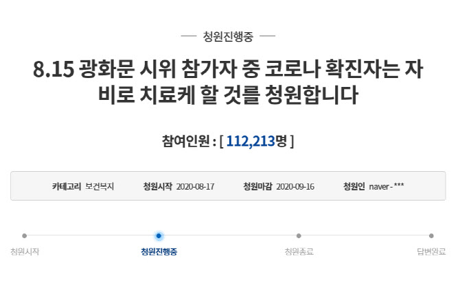 지난 18일 청와대 국민청원 게시판에는 ‘8.15 광화문 시위 참가자 중 코로나 확진자는 자비로 치료케 할 것을 청원합니다’라는 제목의 글이 올라왔다. 이 청원은 19일 오전 8시 30분 현재 11만 2213명이 동의했다.
