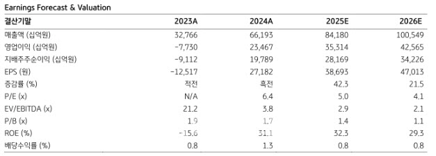 그는 “2025년 실적은 매출과 영업이익이 각각 전년 대비 27%, 50% 증가한84조원, 35조 3000억원으로 예상되고, 2026년 영업이익은 전년 대비 21% 증가한42조 6000억원으로 추정돼 2024년부터 시작된 실적 개선 추세가 3년간 이어질 전망”이라고 전망했다.