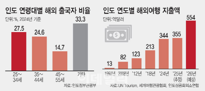 유엔 세계관광기구에 따르면 인도 관광객은 항공료와 숙박비 등 포함 해외여행 시 평균 1200달러 내외를 쓰는 일본과 중국 관광객 대비 적게는 2~3배에 달하는 비용을 지출하는 것으로 나타났다. 사니야 잔프레 스키프트 수석연구원은 지난 10월 아랍에미리트(UAE) 아부다비에서 열린 ‘스키프트 글로벌 포럼’에서 “인도는 30분마다 백만장자가 탄생한다는 말이 나올 정도로 자산가들이 빠르게 늘고 있다”며 “전체 인구의 중산층 비율이 2031년 38%까지 늘면서 해외여행 수요도 증가할 것”으로 전망했다.