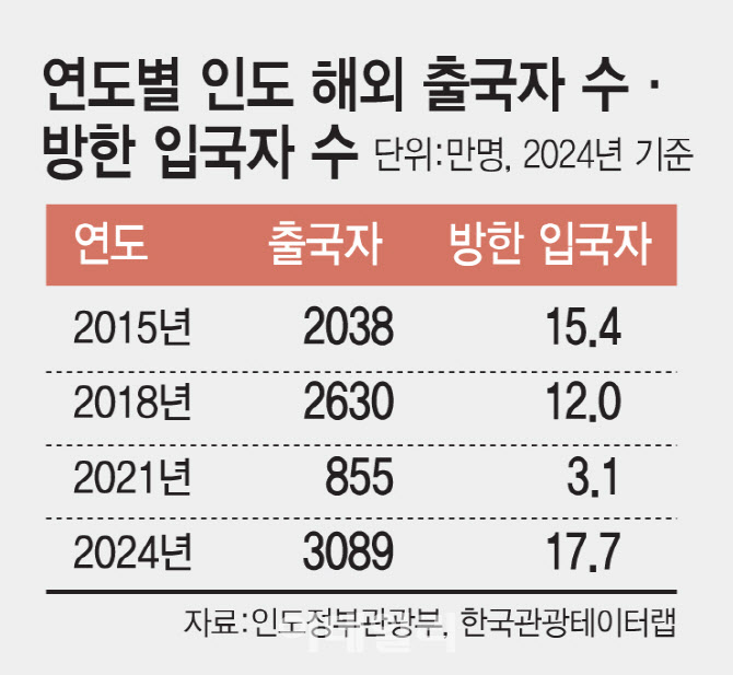최근 중국과의 관계 개선으로 대중(對中) 마케팅 확대에 나선 정부·지자체, 업계가 되짚어봐야 할 대목이다. 작년 기준 전체 인도 아웃바운드 시장에서 한국 비중은 단 0.2%에 그쳤다. 일본, 중국의 3분의 1 수준에도 못 미치는 수치다. 방한 외국인 관광객 중 인도 관광객 비중도 간신히 1%를 웃도는 수준이다.