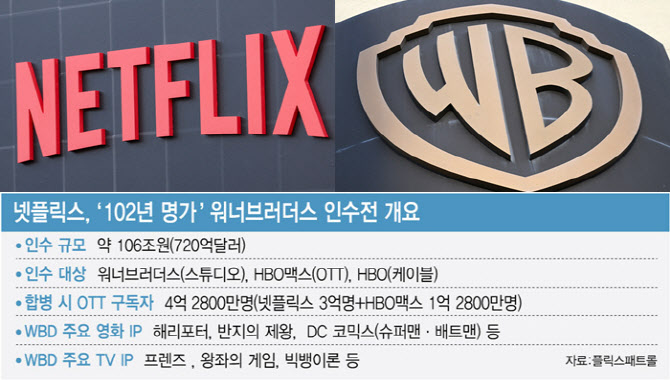 글로벌 온라인동영상서비스(OTT) 넷플릭스의 워너브러더스 디스커버리(WBD, 워너브러더스) 인수 추진 소식에 콘텐츠 제작사 관계자들은 당황한 기색이 역력했다. “넷플릭스가 절대 강자가 되면 좋을 게 없다” “넷플릭스 영향력이 커질수록 한국 콘텐츠 업체들의 협상력은 떨어지게 된다” 등 우려 섞인 푸념도 나왔다.