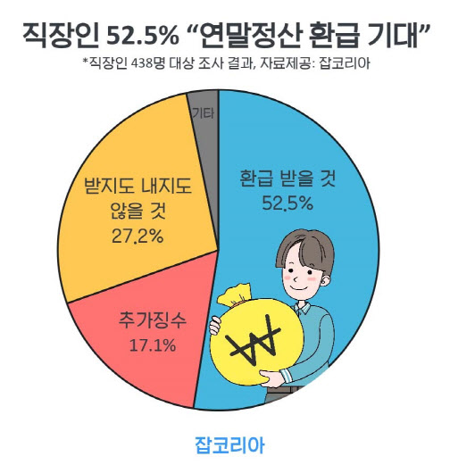 취업포털 잡코리아가 직장인 438명을 대상으로 ‘연말정산 예상’을 물은 결과, 직장인 중 52.5%는 ‘소득공제 환급을 받을 것’이라고 답했다고 13일 밝혔다. 이어 ‘세금을 더 낼 것(추가징수)’으로 예상한 응답률은 17.1%였고, 27.2%는 ‘받지도 내지도 않을 것’이라고 예상했다.