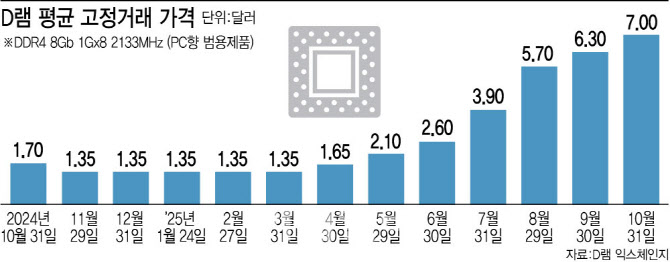 고정거래가격 또한 급등하고 있다. 시장조사업체 D램익스체인지에 따르면 지난달 PC향 범용제품인 DDR4 8Gb(1Gx8 2133MHz)의 평균 고정거래가격은 7달러로 나타났다. 해당 제품 가격은 7개월 연속 상승 중이며 지난해 10월 1.7달러였던 점을 감안하면 1년 새 311.8% 폭등했다. 7달러를 넘은 건 2018년 12월 7.25달러 이후 약 6년 10개월 만이다.