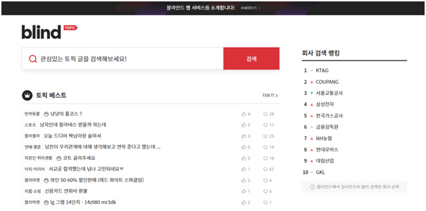 블라인드 웹 서비스에는 앱에는 없는 ‘토픽 베스트’와 ‘회사 검색 랭킹’ 서비스가 추가되었다. ‘토픽 베스트’는 전체 토픽 게시물 중 좋아요와 댓글이 많은 게시물을 상위 10개를 보여주는 채널이다.