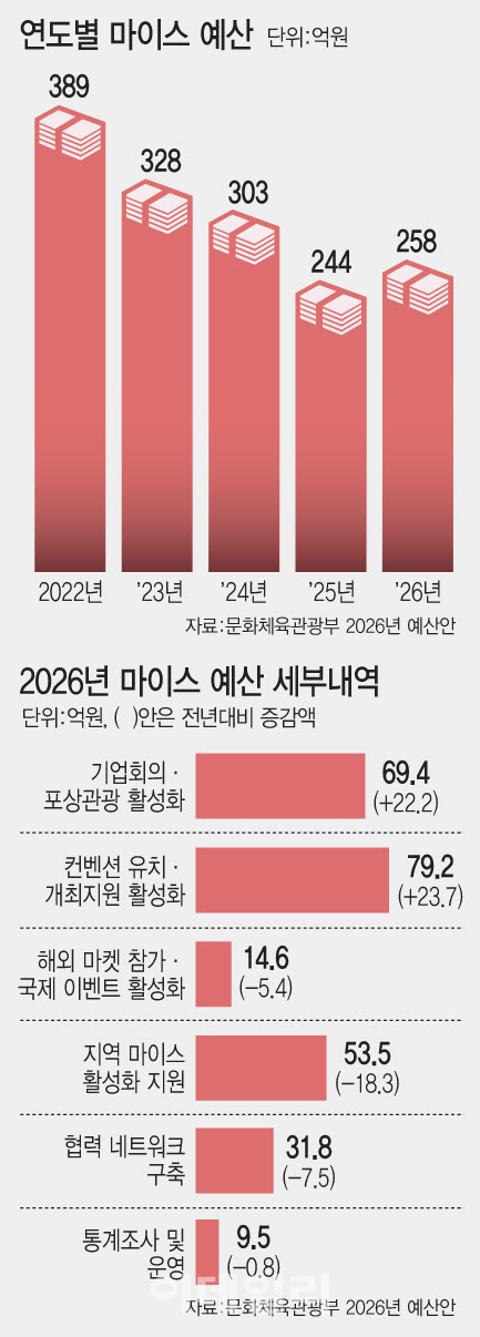 유치보다 홍보 목적이 강했던 ‘해외 마켓 참가’를 비롯해 지역 축제, 스포츠 대회 지원 등 ‘국제 이벤트 활성화’는 14억 6200만 원으로 27%가 감액됐다. 국내 전시·박람회와 연계해 추진하던 블레저(비즈니스+레저) 관광 지원 예산도 64% 넘게 삭감되면서 3억 원으로 줄었다. 민·관·산·학 협력 사업인 ‘마이스 산업 협력 네트워크 구축’도 감액 대상 사업에 포함돼 19%가량 줄어든 31억 원이 배정됐다.
