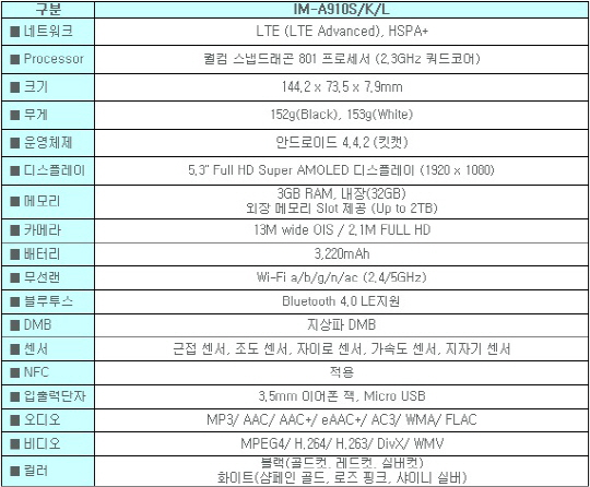 5.3인치 풀 HD 수퍼 아몰레드 디스플레이와 퀄컴의 최신 ‘스냅드래곤 801’ 프로세서, ‘3GB LPDDR3 램’을 탑재해 빠른 속도를 제공한다. 7mm대 두께와 152g의 무게로 전작보다 더 가볍고 얇으며 스마트폰 최대 수준인 3220mAh급 배터리를 채택했다.