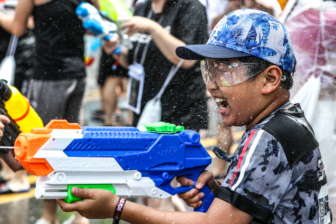 7일 오후 서울 서대문구 신촌 연세로에서 열린 제7회 신촌 물총축제에서 참가자들이 물총싸움을 즐기며 더위를 날리고 있다. 2019.7.7/뉴스1