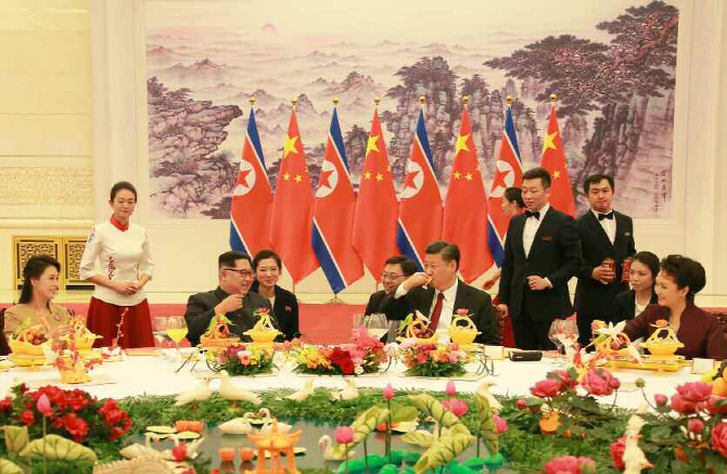 지난 28일 북한 노동신문이 공개한 사진에는 김 위원장이 26일 베이징 인민대회당에서 열린 연회에서 시진핑 중국 국가주석과 건배하는 모습이 담겼다.