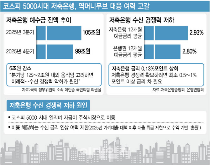 저축은행업계 관계자는 “저축은행 예수금 가운데 수시입출금예금 비중이 5%에도 미치지 않는데, 예수금 감소 폭이 큰 것은 이례적”이라며 “가계대출 규제로 신규 대출이 절반 가량 축소된 상황에서 유동성 방어를 위해 수신 금리를 인상할 경우 전반적인 수익성 악화로 이어질 수 있다”고 말했다. 이어 “중금리 대출 규제 완화와 함께 유가증권 투자 한도 확대 등 수익 다변화 방안이 필요하다”고 덧붙였다.