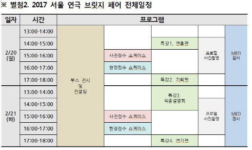 ‘연극 브릿지페스티벌’은 전국 대학의 예비연극인의 안정적 연극계 안착을 돕고자 기획한 페스티벌로 배우 지망생과 대학로 연극계 사이에 가교역할을 해왔다. 페스티벌의 한계성을 극복하고 범위와 대상을 확대, 다양한 직종을 소개하고자 ‘2017 서울 연극 브릿지 페어’로 이름을 변경하고 비전공자와 경력단절 취업희망자까지 아우르는 연극 전문 직종 설명회로 탈바꿈했다. 자세한 내용은 서울연극협회 홈페이지(www.stheater.or.kr)에서 확인 가능하다. 입장료는 무료다.