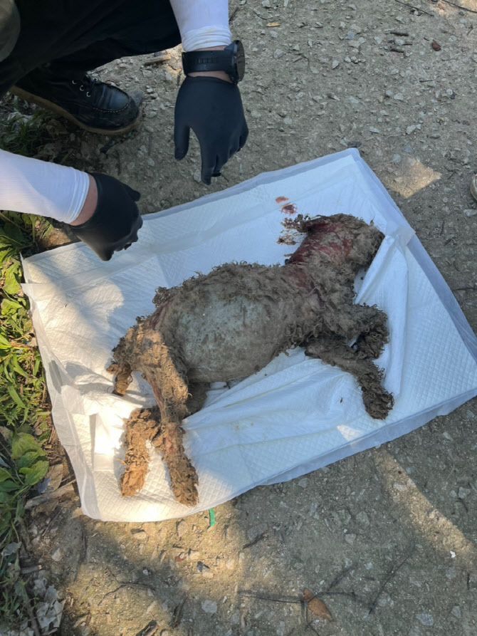 | | 지난 24일 '루시의 친구들'이 구조 작업을 벌인 인천 강화군의 한 번식장에서 숨진 채 발견된 개 한마리. (사진=루시의친구들 제공) |