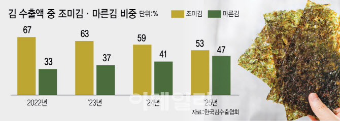 문제는 김 수출이 늘고 있지만, 상대적으로 부가가치가 높은 조미김 수출 비중이 줄고 있다는 점이다. 마른김은 물김(원초)에서 바닷물을 빼 건조한 것으로 1차 가공품이고, 마른김을 구워 기름을 바르고 소금 간을 한 것이 2차 가공품인 조미김이다. 최근 3년간 전체 김 수출(금액기준)에서 조미김이 차지하는 비율은 2022년 67%에서 지난해 59%로 떨어졌고 올들어(1~4월) 53%로 더 낮아졌다. 그만큼 마른김 수출 비중이 커졌다.