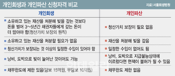 개인회생은 ‘갱생형 제도’로 3~5년간 일정 금액을 변제한 후 나머지 채무를 면책받는다. 개인파산은 ‘청산형 제도’로 현재 재산을 처분해 채권자에게 배당한 후 남은 채무를 전부 면책받는다.