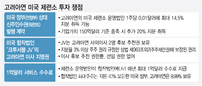 또 크루서블 메탈은 고려아연과 미국의 합작법인(JV)에 매년 1억달러 규모의 수수료를 지급하기로 했다. 바로 이 JV가 고려아연의 19억4000만달러(약 2조8500억원) 규모 유상증자에 참여해 지분 10.59%를 확보하게 된다.