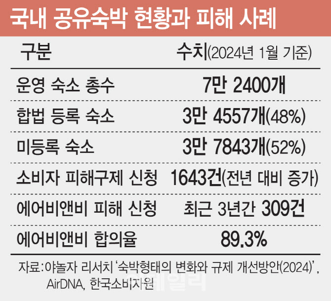 이 같은 비정상인 구조는 소비자 피해로 직결됐다. 한국소비자원에 따르면 최근 3년간 에어비앤비 관련 피해구제 신청은 309건에 달한다. 환불 불이행, 예약 누락, 위생 문제 등 상당수가 미등록 숙소에서 발생했다. 김형우 한반도문화관광연구원 원장은 “안전·위생 점검과 세금 납부가 이뤄지지 않는 미등록 숙소가 소비자 피해의 주범”이라며 “퇴출은 시장 자정을 위해 반드시 필요한 조치”라고 진단했다.