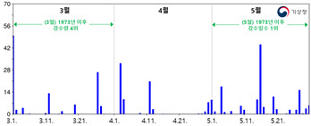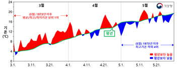 그러다 4월엔 한파와 초여름 더위가 번갈아가며 나타났고, 4월 중순 이후에는 흐리고 선선한 날이 많아 5월 평균기온(16.6℃)은 1995년(16.0℃) 이래 가장 낮았고, 최고기온은 하위 4위를 기록했다.